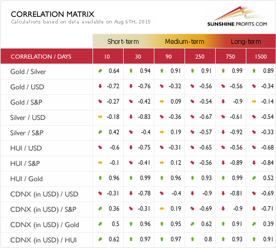Now, you have probably noticed that each row displays various correlations, not just one number. The different numbers show you the correlation over a given number of days, from 10 to 1500 (10 and 30 are marked as short-term, 90 and 250 as medium-term, 750 and 1500 as long-term). These different numbers of days are organized in columns (10, 30, 90 and so on). Putting the rows together with the columns gives you specific correlations. For example, the number in the “Gold / Silver” row, in the 1500 column is 0.89. This means that the correlation between gold and silver over the last 1500 days was 0.89. If you look at the “Gold / S&P” row and the 10 column, you see -0.27. This means that the correlation between gold and the S&P 500 index over the past 10 days stood at -0.27.