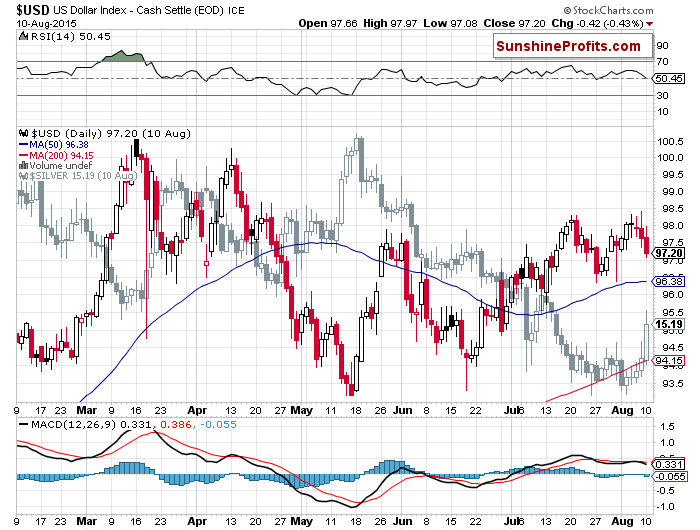 Our last example will focus on silver and the U.S. dollar (“Silver / USD” row). It shows how you can combine the info on correlation with charts, for example to call a local bottom. The long-term correlation (1500 days) between silver and the U.S. dollar used to be negative at -0.54. The shorter-term correlation for the 30 day window is even more negative at -0.83. But the 10 day correlation is much weaker and not that negative at all (0.18). What might this mean? That silver has very recently stopped moving together with the U.S. dollar. Let’s take a look at the U.S. Dollar Index chart (charts courtesy by http://stockcharts.com).