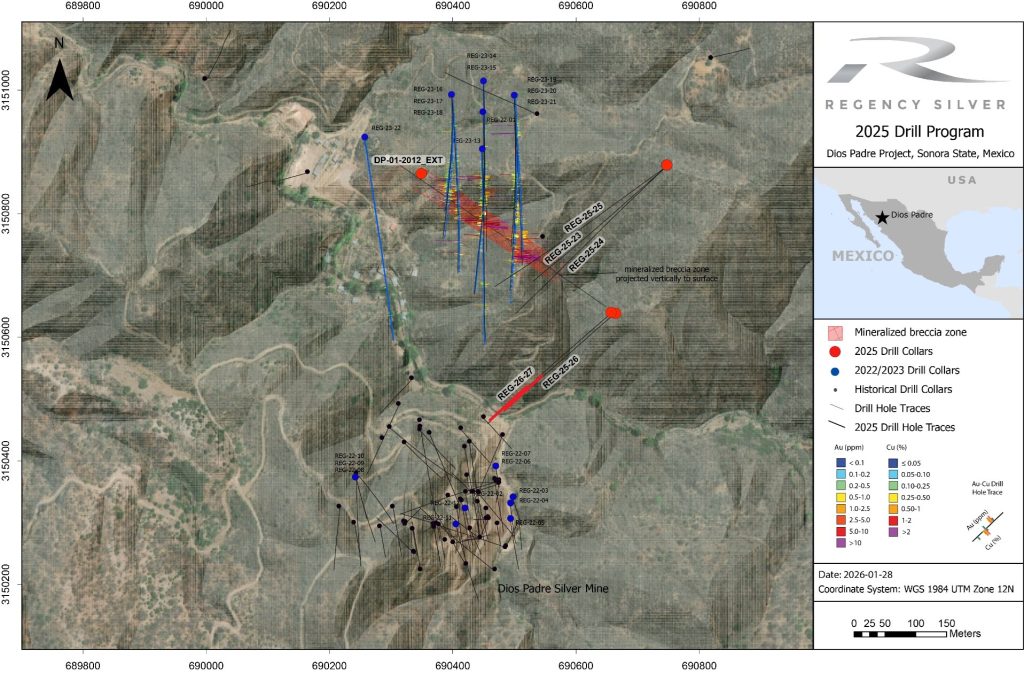 Regency Silver (TSXV:RSMX) has reported results from the first drill hole completed as part of its 2026 drilling campaign at the Dios Padre project in Sonora, Mexico, where drilling remains ongoing. The program is designed to further evaluate mineralized structures identified in earlier campaigns near the historic Dios Padre silver mine.